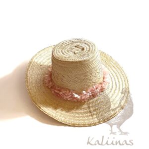 Sombrero elaborado en Palma Wayuu. Este es un producto tradicional de la Cultura proveniente de La Guajira, con este accesorio los hombres se cubren tradicionalmente del sol, para realizar sus actividades diarias. Este diseño cuenta con una cinta de rosas color rosado
